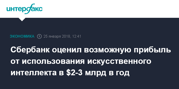 "Мы пытаемся понять, сколько денег мы заработаем от использования искусственного интеллекта и машинного обучения. В нашем случае это не менее $2 млрд прибыли в год, не менее, между $2 млрд и $3 млрд. Это очень важный вопрос для всех", - сказал Греф в рамках делового завтрака Сбербанка в ходе Всемирного экономического форума в Давосе. Он добавил, что Сбербанк потратил много времени на осознание того, что для него значит искусственный интеллект и как его можно использовать.