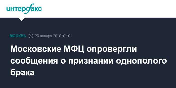 Москва. 26 января. INTERFAX.RU - Московские многофункциональные центры предоставления государственных услуг опровергли информацию СМИ о том, что столичный МФЦ признал законным брак между двумя мужчинами, заключенный в Дании.