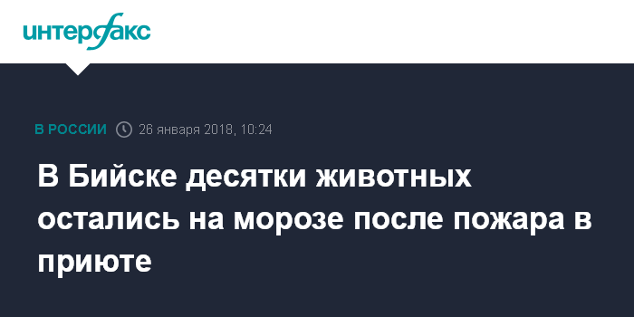 Москва. 26 января. INTERFAX.RU - Возгорания произошло в обществе защиты животных "Преданность" в Бийске (Алтайский край) во время сорокаградусных морозов, сообщает в пятницу пресс-центр главного управления МЧС РФ по региону.