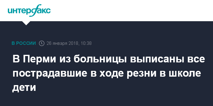 Москва. 26 января. INTERFAX.RU - Всех учеников пермской школы N127, пострадавших в результате нападения подростков, выписали из краевой детской клинической больницы, сообщается на сайте регионального министерства здравоохранения.