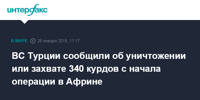 Москва. 26 января. INTERFAX.RU - Генштаб Вооруженных сил Турции проинформировал, что с начала операции "Оливковая ветвь" в Африне на северо-западе Сирии уничтожены или захвачены в плен более 340 курдов, сообщает Анатолийское агентство новостей.