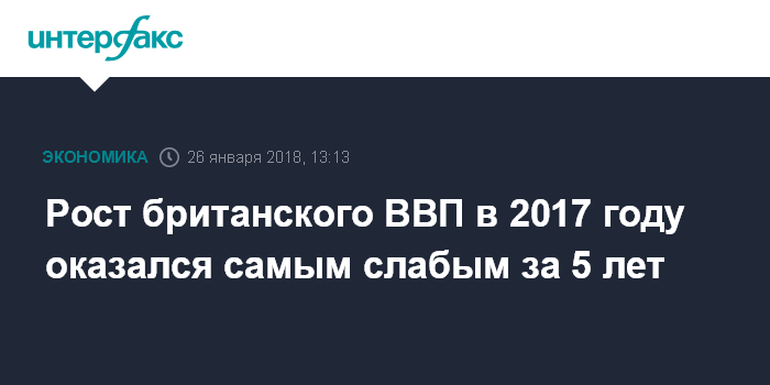 Москва. 26 января. INTERFAX.RU - Британская экономика по итогам 2017 года выросла на 1,8%, что стало самым слабым результатом за пять лет. Об этом свидетельствуют предварительные данные Национального статистического управления (ONS).