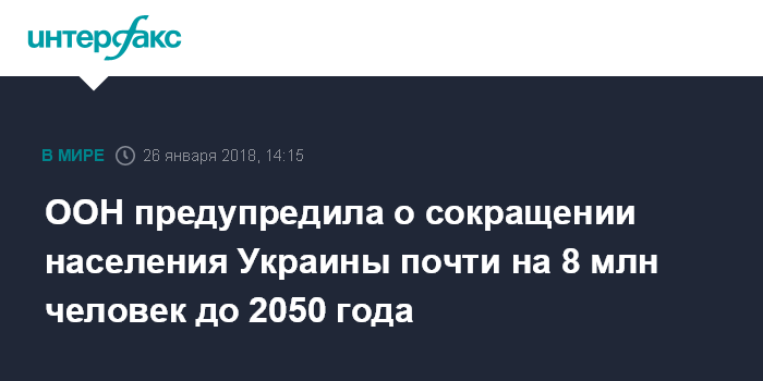 Москва. 26 января. INTERFAX.RU - В ООН прогнозируют, что население Украины до 2050 может уменьшиться до 36,4 млн человек, то есть на 15%.