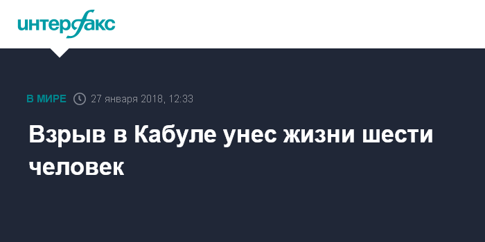 Москва. 27 января. INTERFAX.RU - Мощный взрыв, прогремевший в субботу в афганской столице, привел к гибели не менее шести человек, передает BBC.