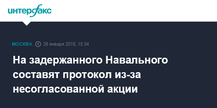 "На Тверской улице столичной полицией был задержан Навальный, один из организаторов несогласованного публичного мероприятия. В настоящее время он доставлен в территориальный отдел полиции для разбирательства и составления протокола об административном правонарушении, предусмотренном статьей 20.2 КоАП РФ. (нарушение установленного порядка организации либо проведения собрания, митинга, демонстрации, шествия или пикетирования)", - сообщил собеседник агентства.