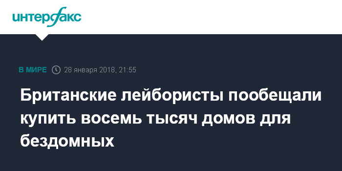Москва. 28 января. INTERFAX.RU - Лидер британской партии лейбористов Джереми Корбин пообещал, что его партия купит восемь тысяч домов для бездомных в случае своей победы на выборах, сообщает в воскресенье "Би-Би-Си".