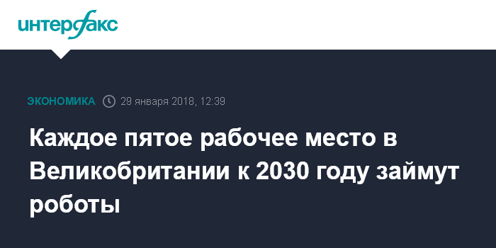 Москва. 29 января. INTERFAX.RU - Каждое пятое рабочее место (21%) в Великобритании к 2030 году будет занято роботами, свидетельствуют данные исследовательского института Centre for Cities. От этих изменений на рынке труда больше всего пострадают жители севера Англии, пишет The Sun.