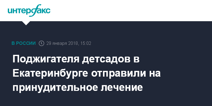 Москва. 29 января. INTERFAX.RU - Мировой судья Кировского района Екатеринбурга в понедельник отправил на принудительное лечение местного жителя за серию поджогов веранд детских садов, говорится в сообщении руководителя пресс-службы главного управления МВД России по Свердловской области Валерия Горелых.