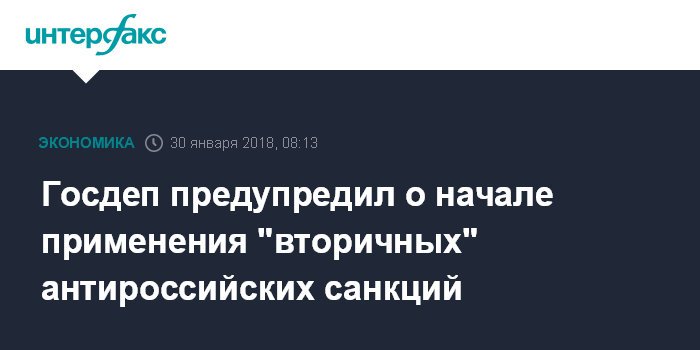 "Начиная с сегодняшнего дня (понедельник, 29 января, по местному времени - ИФ) Госдепартамент может начать вводить санкции в соответствии с разделом 231 закона "О противодействии противникам США посредством санкций" (Countering America's Adversaries Through Sanctions Act; CAATSA) за значительные транзакции организациями из российского оборонного или разведывательного сектора", - говорится в заявлении американского внешнеполитического ведомства, которое было опубликовано в понедельник.