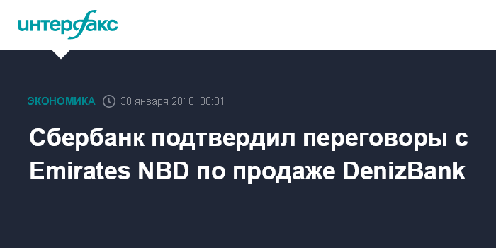 Москва. 30 января. INTERFAX.RU - Сбербанк России подтверждает, что приступил к обсуждению с Emirates NBD продажи доли в уставном капитале своей турецкой "дочки" DenizBank, говорится в пресс-релизе Сбербанка.