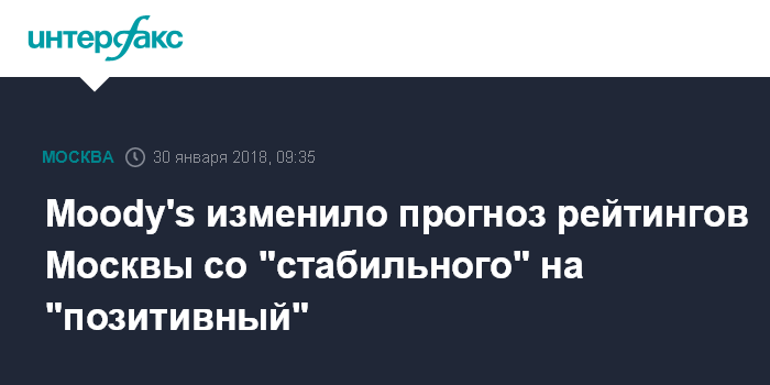 Москва. 30 января. INTERFAX.RU - Международное рейтинговое агентство Moody's Investors Service изменило прогнозы рейтингов Москвы и Московской области, Санкт-Петербурга, а также еще 8 регионов и двух госкомпаний со "стабильного" на "позитивный" вслед за аналогичным действием по отношению к суверенному рейтингу России.