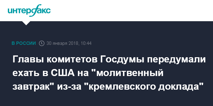 Главы комитетов Госдумы передумали ехать в США на "молитвенный завтрак" из-за "кремлевского доклада"