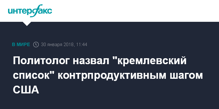 Москва. 30 января. INTERFAX.RU - Публикация так называемого "кремлевского списка" является контрпродуктивным шагом США с точки зрения двусторонней кооперации с РФ в решении важнейших мировых проблем, считает директор Центра политической конъюнктуры Алексей Чеснаков.
