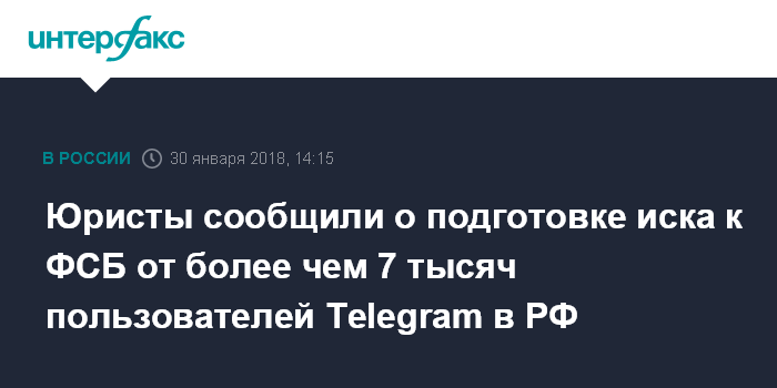 Москва. 30 января. INTERFAX.RU - Глава правозащитной группы "Агора" Павел Чиков, чьи юристы представляют интересы Telegram, сообщает о подготовке коллективного судебного иска пользователями мессенджера к ФСБ РФ из-за требования предоставлять ведомству ключи для расшифровки электронных сообщений.