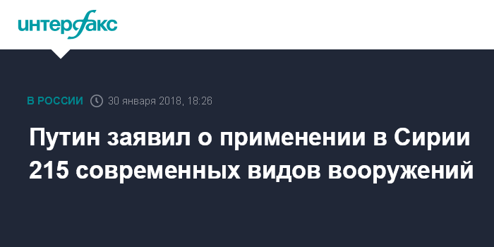 Москва. 30 января. INTERFAX.RU - Более двух сотен современных и перспективных видов вооружений было применено российскими военными в Сирии, заявил президент РФ Владимир Путин во вторник на военно-практической конференции по итогам специальной операции в Сирии.