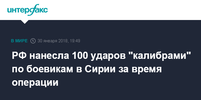 Москва. 30 января. INTERFAX.RU - Корабли и подводные лодки Военно-морского флота РФ нанесли сто ударов крылатыми ракетами "Калибр" по боевикам в Сирии, сообщил министр обороны РФ Сергей Шойгу, выступление которого приведено на сайте министерства.