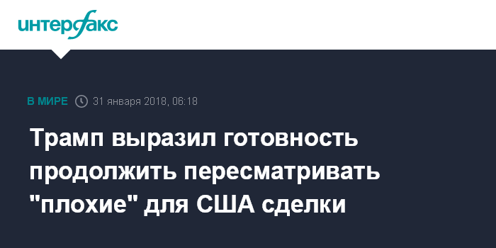 Москва. 31 января. INTERFAX.RU - Президент США Дональд Трамп, выступая с обращением к конгрессу, обещал продолжить пересмотр "плохих" для США, с его точки зрения, сделок.
