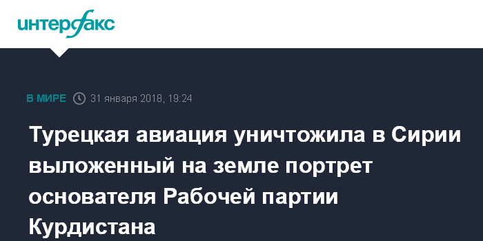 Москва. 31 января. INTERFAX.RU - ВВС Турции в ходе операции "Оливковая ветвь" на севере Сирии разбомбили выложенный на земле портрет Абдуллы Оджалана - курдского деятеля, основателя и лидера Рабочей партии Курдистана, передает в среду Анатолийское агентство новостей.