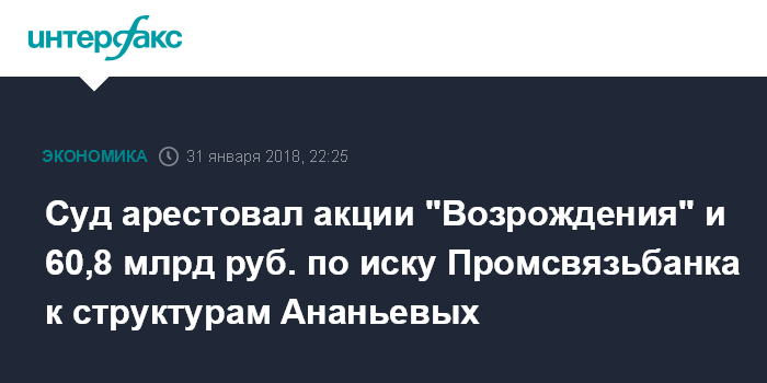 Суд арестовал акции "Возрождения" и 60,8 млрд руб. по иску Промсвязьбанка к структурам Ананьевых