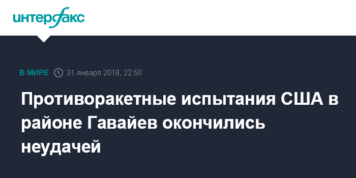 Москва. 31 января. INTERFAX.RU - Американские военные в среду провели неудачные противоракетные испытания в районе Гавайских островов, передает CNN со ссылкой на свои источники.
