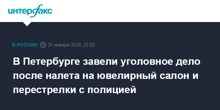 Москва. 31 января. INTERFAX.RU - Уголовное дело о разбое и покушении на жизнь полицейского возбуждено в Санкт-Петербурге после налета на ювелирный салон и перестрелки с патрульным экипажем, сообщили в среду в пресс-службе Следственного комитета.