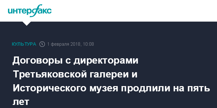Москва. 1 февраля. INTERFAX.RU - Директора Государственной Третьяковской галереи и Государственного Исторического музея останутся на своих постах ещё на пять лет, сообщили журналистам в пресс-службе Минкультуры в четверг.
