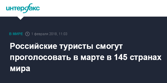 Москва. 1 февраля. INTERFAX.RU - Россияне, находящиеся во время президентских выборов 18 марта за рубежом, смогут проголосовать на 370 избирательных участках в 145 странах мира, сообщает Ростуризм.
