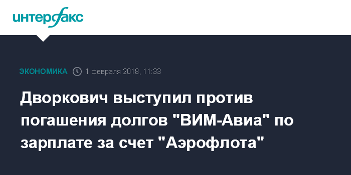 Москва. 1 февраля. INTERFAX.RU - Вице-премьер РФ Аркадий Дворкович высказался против погашения долгов "ВИМ-Авиа" перед ее сотрудниками за счет средств "Аэрофлота" .
