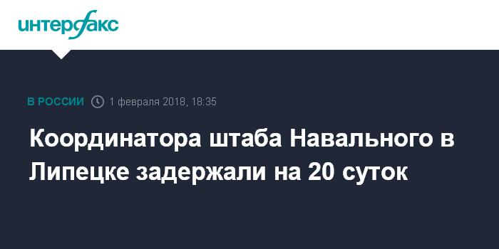 Москва. 1 февраля. INTERFAX.RU - Советский районный суд Липецка назначил административный арест координатору местной "Команды Навального" за проведение несанкционированной акции 28 января, сообщают активисты в группе штаба в соцсети "ВКонтакте".