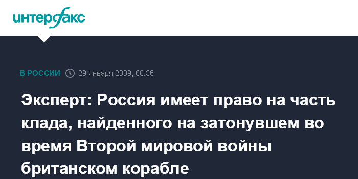Москва. 29 января. INTERFAX.RU - Россия может претендовать на часть клада, найденного на борту затонувшего британского грузового корабля, доказать это право должно Минкультуры, считает российский эксперт.