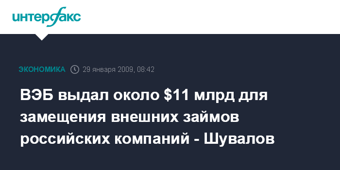 Давос. 29 января. INTERFAX.RU - ВЭБ выдал около $11 млрд для замещения внешних займов российских компаний. "Из запланированных $50 млрд на сегодняшний день ВЭБ выдал около $11 млрд для замещения внешних займов российских компаний", - сообщил журналистам первый вице-премьер РФ Игорь Шувалов. "Было свыше 100 заявок, но идет жесточайший отбор", - подчеркнул он.