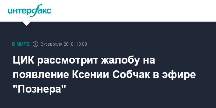 "К нам поступила жалоба на появление Ксении Собчак в эфире программы "Познер". Жалоба поступила не от кандидата, а от гражданина РФ", - сказала Гришина.