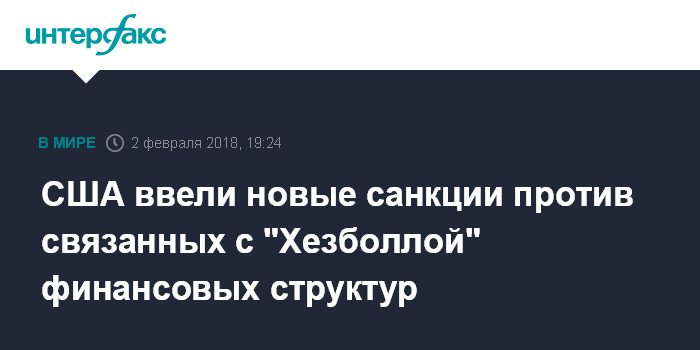 Москва. 2 февраля. INTERFAX.RU - Минфин США объявил о новых санкциях против физических и юридических лиц, имеющих отношение к финансовой сети ливанского шиитского движения "Хезболла". Об этом сообщает в пятницу агентство Associated Press со ссылкой на заявление ведомства.