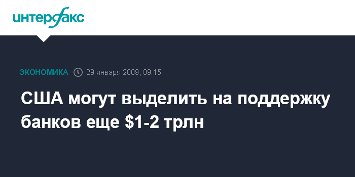 Вашингтон. 29 января. INTERFAX.RU - Администрация президента США Барака Обамы обсудила возможность направить еще $1-2 трлн на восстановление пошатнувшегося здоровья американской финансовой системы, пишет The Wall Street Journal со ссылкой на свои источники.