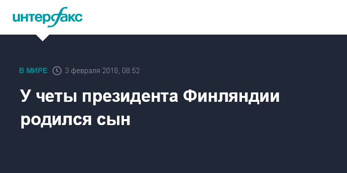 "Мы теперь родители маленького мальчика", сообщил в фейсбуке президент . О рождении сына у четы президента сообщила и канцелярия главы государства. В сообщении говорится, что отец присутствовал при родах и что мать и новорожденный сын чувствуют себя хорошо. Ребенок родился около восьми часов вечера в Женской клинике (Naistenklinikka) в Хельсинки.