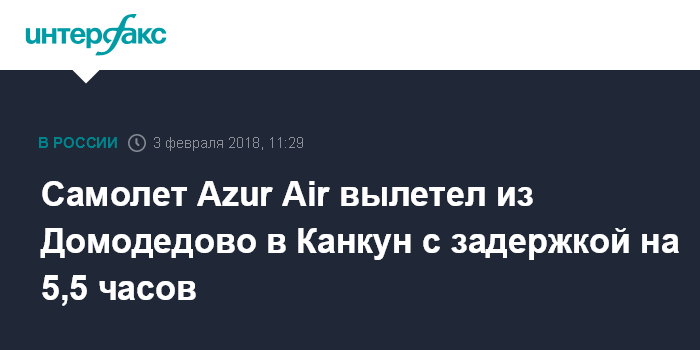 Москва. 3 февраля. INTERFAX.RU - Самолет авиакомпании Azur Air вылетел из московского аэропорта Домодедово на курорт Канкун в Мексике с задержкой на 5,5 часов, следует из данных онлайн-табло аэропорта.