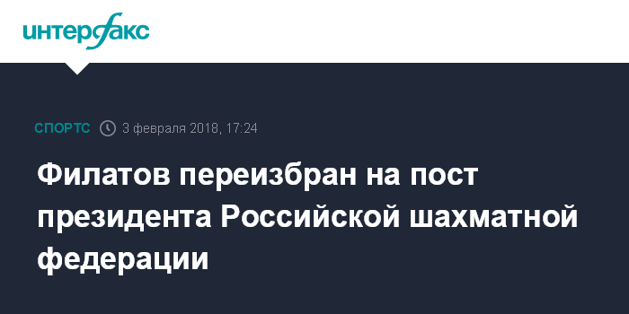 Москва. 3 февраля. INTERFAX.RU - Президентом Российской шахматной федерации (РШФ) на съезде организации избран ее действующий глава Андрей Филатов.