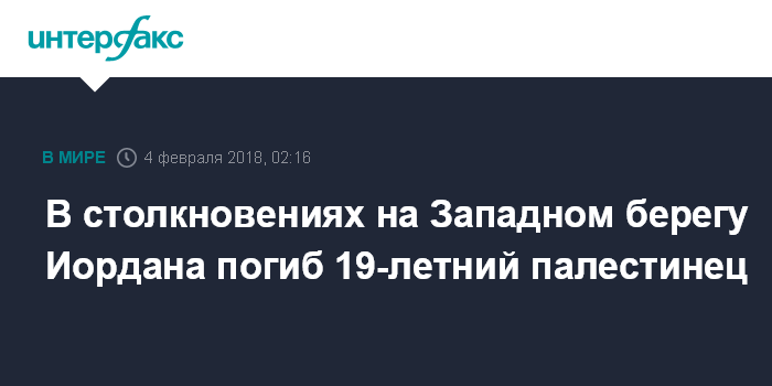 Москва. 4 февраля. INTERFAX.RU - Власти Палестины заявляют, что в результате столкновений с израильскими военными на Западном берегу реки Иордан погиб 19-летний палестинец, сообщает в субботу Jerusalem Post.