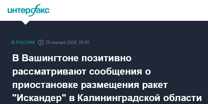 Москва. 29 января. INTERFAX.RU - Как позитивный шаг охарактеризовал сообщения прессы о приостановке размещения российских ракет "Искандер" в Калининградской области исполняющий обязанности пресс-секретаря госдепа США Роберт Вуд.