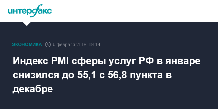 Москва. 5 февраля. INTERFAX.RU - Индекс PMI сферы услуг России в январе 2018 года составил 55,1 пункта против 56,8 пункта в декабре, свидетельствуют данные исследования IHS Markit.