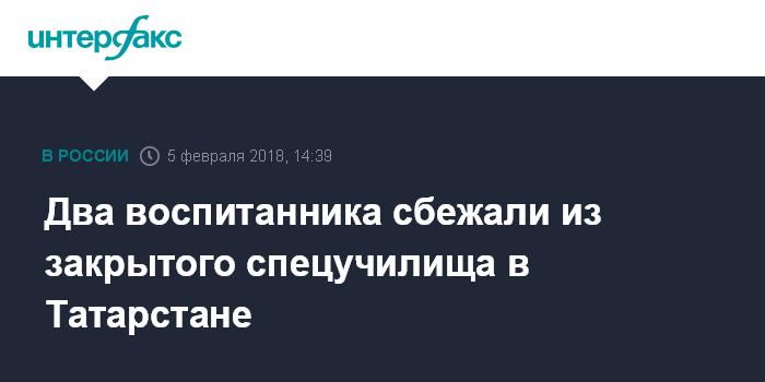 Москва. 5 февраля. INTERFAX.RU - В Татарстане разыскивают двух воспитанников, сбежавших из Раифского спецучилища для обучающихся с девиантным поведением закрытого типа, сообщает прокуратура республики в понедельник.