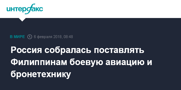 Москва. 6 февраля. INTERFAX.RU - Россия может поставить Филиппинам боевую авиацию и бронетехнику, сообщил "Интерфаксу" во вторник заместитель главы Федеральной службы по военно-техническому сотрудничеству (ФСВТС) России Михаил Петухов.