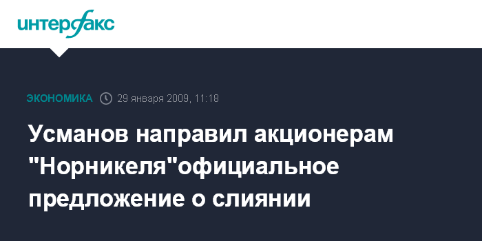 Москва. 29 января. INTERFAX.RU - Основной бенефициар ОАО "ХК "Металлоинвест" Алишер Усманов направил акционерам ОАО "ГМК "Норильский никель" Владимиру Потанину и Олегу Дерипаске официальное предложение о слиянии.