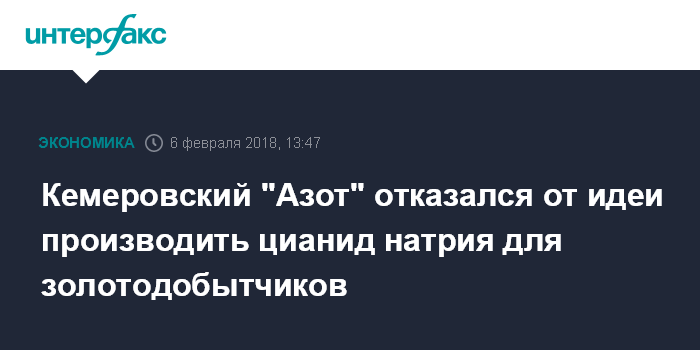 Он также пояснил тогда, что идея организации выпуска цианида натрия на "Азоте" была обусловлена его географическим расположением. "Цианид натрия применяют предприятия, которые добывают рудное золото. Производители этого продукта (цианида натрия - ИФ) находятся в европейской части (РФ - ИФ), а географические потребители находятся от нас (от Кемеровской области - ИФ) в сторону Дальнего Востока. И поэтому мы сами себе задали вопрос - ну если уж его там производят и возят через нас, может быть попытаться (на "Азоте" - ИФ) его производить и сделать хотя бы ТЭО", - сказал Безух.
