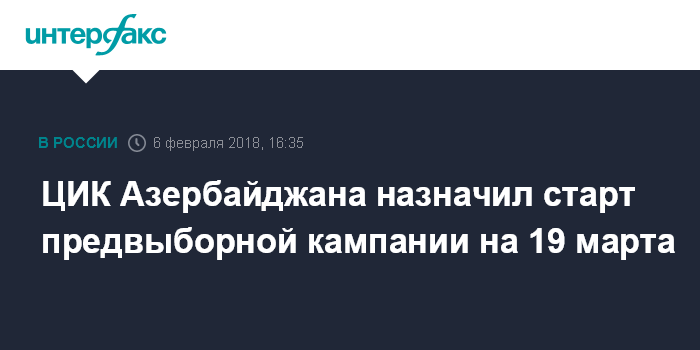 Москва. 6 февраля. INTERFAX.RU - Избирательная кампания в рамках внеочередных выборов президента Азербайджана начнется в республике 19 марта, сообщили в Центральной избирательной комиссии (ЦИК) Азербайджана.