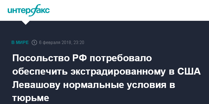 Москва. 6 февраля. INTERFAX.RU - Посольство РФ в Вашингтоне обратилось в Госдепартамент США с требованием обеспечить обвиняемому в хакерских атаках россиянину Петру Левашову нормальные условия содержания.