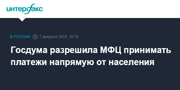 Москва. 7 февраля. INTERFAX.RU - Госдума РФ на заседании в среду приняла в окончательном, третьем чтении правительственный законопроект, наделяющий многофункциональные центры (МФЦ) правом напрямую принимать платежи у населения.
