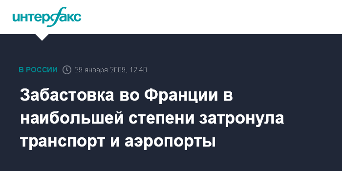 Москва. 29 января. INTERFAX.RU - Общественный транспорт крупных французских городов и аэропорты Парижа в наибольшей степени пострадали от общенациональной забастовки, созванной в четверг по призыву профсоюзов в поддержку работников, сообщает Национальный центр информации и координации движения Франции.