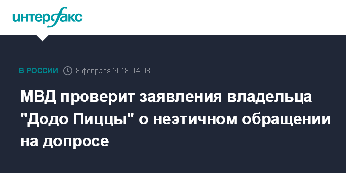 Москва. 8 февраля. INTERFAX.RU - Полиция проводит проверку после жалобы о неэтичном обращении со стороны сотрудников МВД владельца сети "Додо Пицца" Федора Овчинникова, допрошенного в качестве свидетеля по делу о сбыте наркотиков.