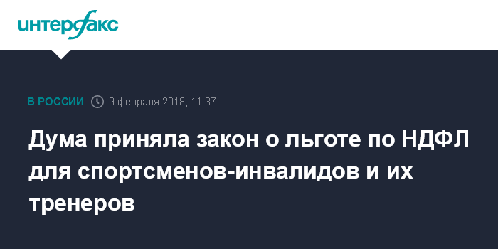 Москва. 9 февраля. INTERFAX.RU - Госдума РФ на заседании в пятницу приняла в окончательном, третьем чтении правительственный закон о предоставлении льгот по налогу на доходы физических лиц (НДФЛ) для спортсменов-инвалидов. Ко второму чтению была внесена поправка о распространении льготы на тренеров.